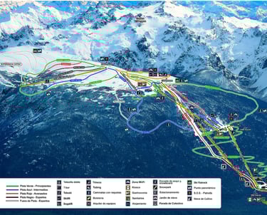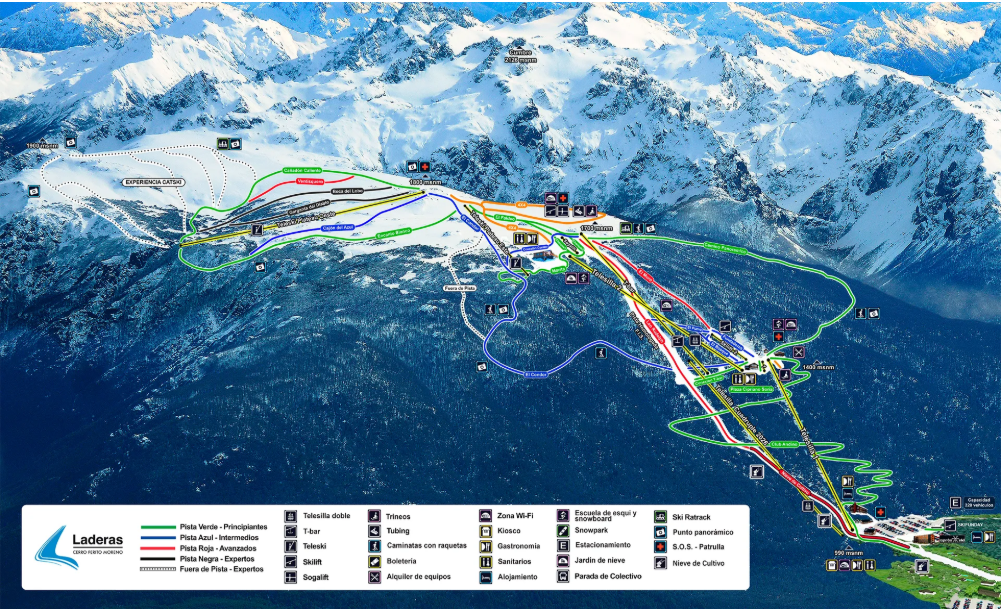 Explorá el mapa de pistas de Laderas y planificá tu día en la nieve. Conocé la ubicación de medios de elevación, niveles de dificultad y servicios en todo el Cerro Perito Moreno.